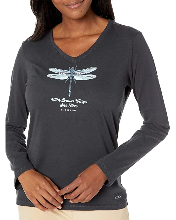 - Life is Good® Detailed Dragonfly Long Sleeve Crusher-Lite™ Vee is a stylish addition to the closet and makes a perfect pick to be at utmost comfort all day long.