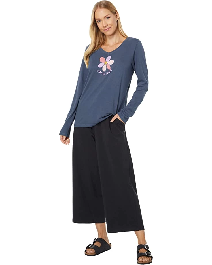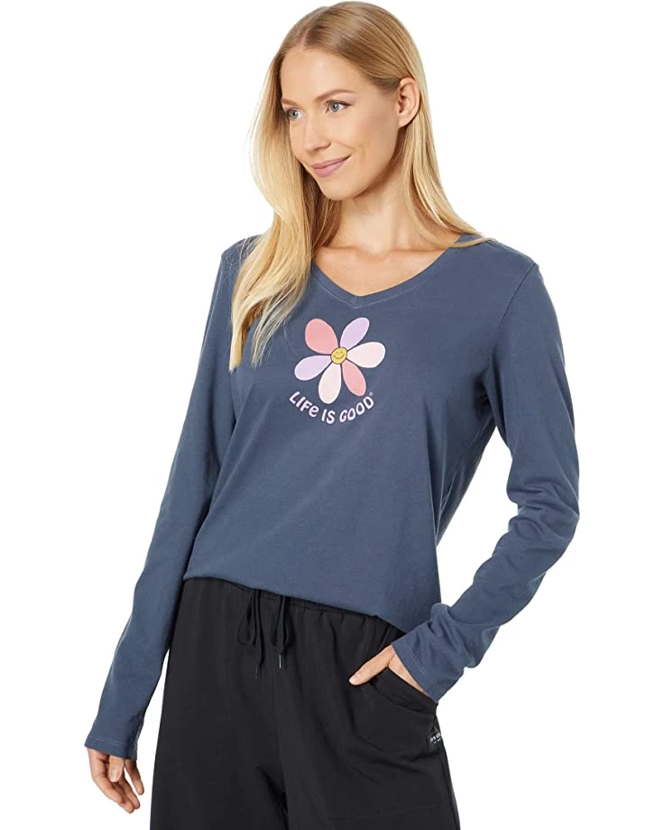 - Showcasing an effortless and attractive print on the front, this Life is Good® Happy Daisy Long Sleeve Crusher™ Vee adds to your simplicity with elegance.